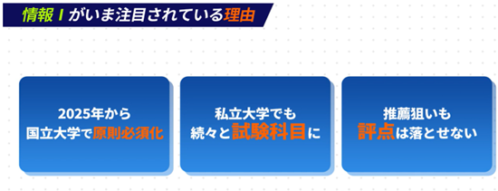 2022年4月より高等学校では「プログラミング」や「データの活用」などを学ぶ「情報Ⅰ」が共通必履修科目となり、2025年の大学入学共通テストでは新たな教科として取り入れられます。これにより、国立大学受験者は「情報Ⅰ」が原則必須化、全国の有名私立大学でも試験学科として続々と追加されています。