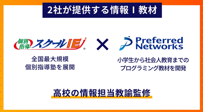 総合教育サービス事業の株式会社やる気スイッチグループ(東京・中央区、以下 やる気スイッチグループ)と人工知能(AI)技術の開発スタートアップの株式会社 Preferred Networks(東京・千代田区、以下PFN)は、2025年に実施される大学入学共通テストで新設科目となる「情報Ⅰ」に備えたオリジナル教材を共同で開発しました。やる気スイッチグループは、本教材を用いて2024年5月よりスクールIE(R)にて「情報Ⅰ」コースを新たに開講します。