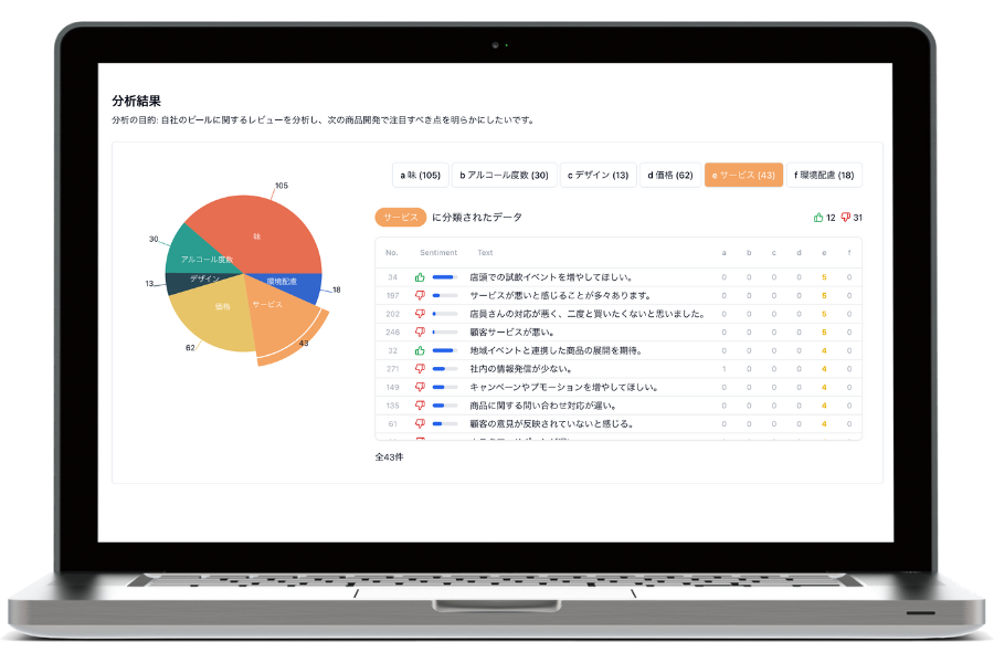 分析目的を入力するだけで、扱いづらい大量の定性データを高速かつ高精度に賢く分類、要約し、インサイトの発掘を支援します。