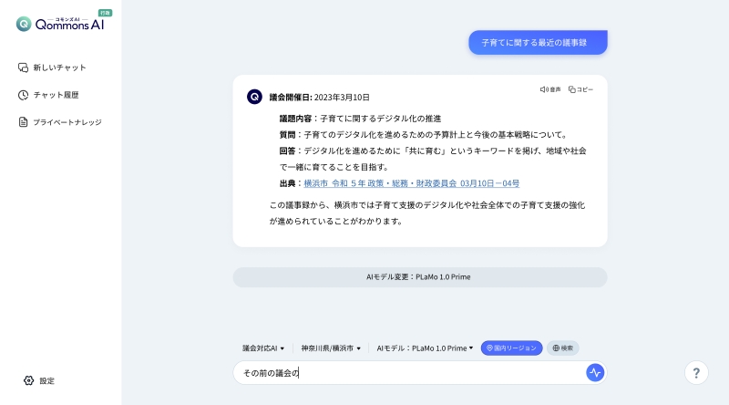 今回、コモンズAIにPLaMo Primeを標準搭載することで、日本語の理解力と生成精度が向上し、法令や条例などの専門性が高い文書作成や、行政特有の複雑な問い合わせへの対応精度が高まり、行政課題の迅速な解決や政策立案の質の向上に大きく貢献することが期待されます。