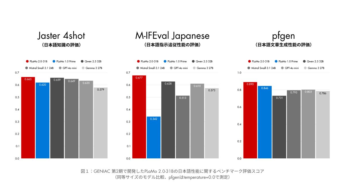 日本語知識(Jaster 4shot )、日本語プロンプトの指示追従性能(M-IFEval Japanese)、日本語文章の生成性能(pfgen)において 同等サイズのGemma3-27B、Qwen2.5-32B、GPT-4o miniなどを上回る評価スコアを達成したPLaMo 2.0-31Bを活用 。