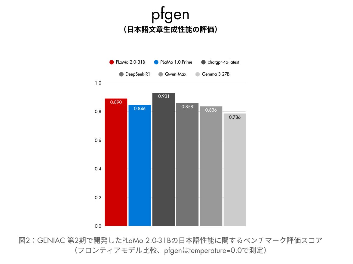 PFNグループは、経済産業省とNEDOが日本の生成AI基盤モデルの開発力向上を目指して実施するプロジェクト「GENIAC(Generative AI Accelerator Challenge)」第2期において、日本語を多く含む 世界最大規模の高品質なデータセット(100Bトークン)を構築 し、それを利用して学習したPLaMo 2.0-31Bをフルスクラッチで開発しました。PLaMo 2.0-31Bは、GENIAC 第1期で開発したPLaMo-100Bの3分の1以下のモデルサイズにもかかわらず、各種ベンチマークのほぼすべてでPLaMo-100Bを上回り、同等サイズのフロンティアモデルと比較しても高い評価スコアを達成しています(図1)。なかでも、日本語の生成能力を評価するベンチマーク(pfgen)においては、GPT-4oに次ぐ高い評価スコアを記録しており、DeepSeek-R1やQwen-Maxよりも高い日本語生成能力を示しています(図2)。