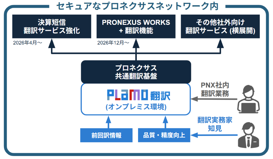 PNXは、PLaMo翻訳の社内利用で生成AIによる翻訳ノウハウを蓄積したうえで、PNXが提供する開示書類作成支援システム「PRONEXUS WORKS」において、PLaMo翻訳を活用した決算短信の全訳機能を2026年12月に実装する予定です。