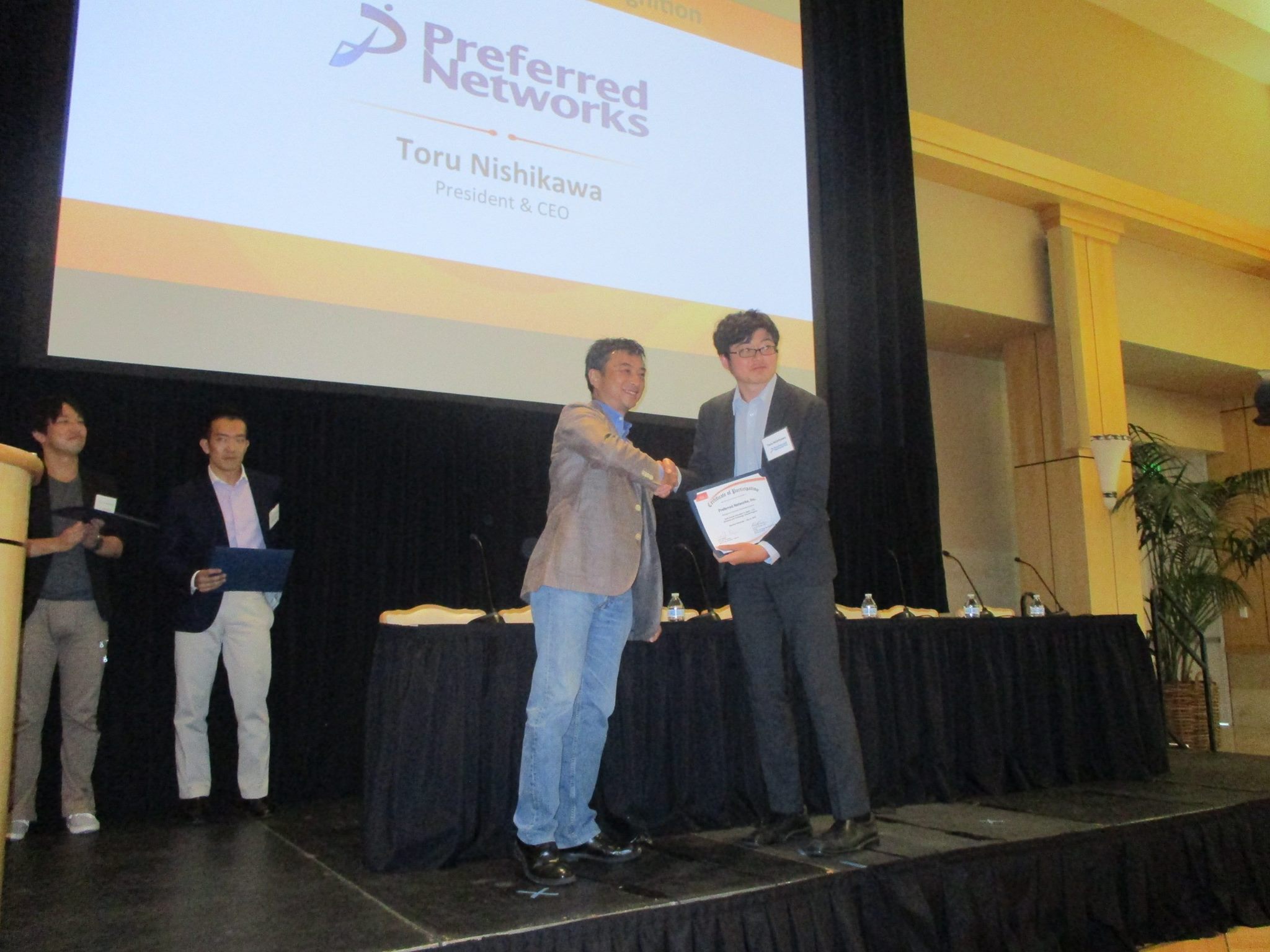株式会社Preferred Networks(プリファード・ネットワークス、本社:東京都千代田区、創業者 代表取締役社長:西川 徹、以下PFN)は米国時間7月22日(金)にスタンフォード大学にて開催された、2016 Japan-US Innovation Awardにおいて、日本発の革新的なスタートアップ企業を選出する「2016 Innovation ShowCase」の1社に選ばれましたので、お知らせいたします。